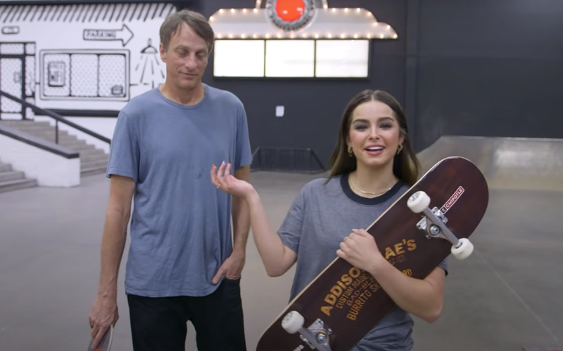 Addison Rae teve uma aula de skate com a lenda Tony Hawk e não fazíamos ideia do quanto precisávamos desse encontro.